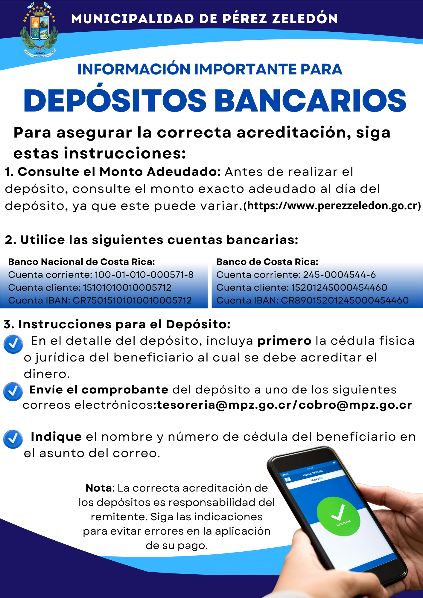 La Municipalidad de Pérez Zeledón no solicita pagos ni información personal a través de llamadas, mensajes de texto, redes sociales o correos electrónicos personales.